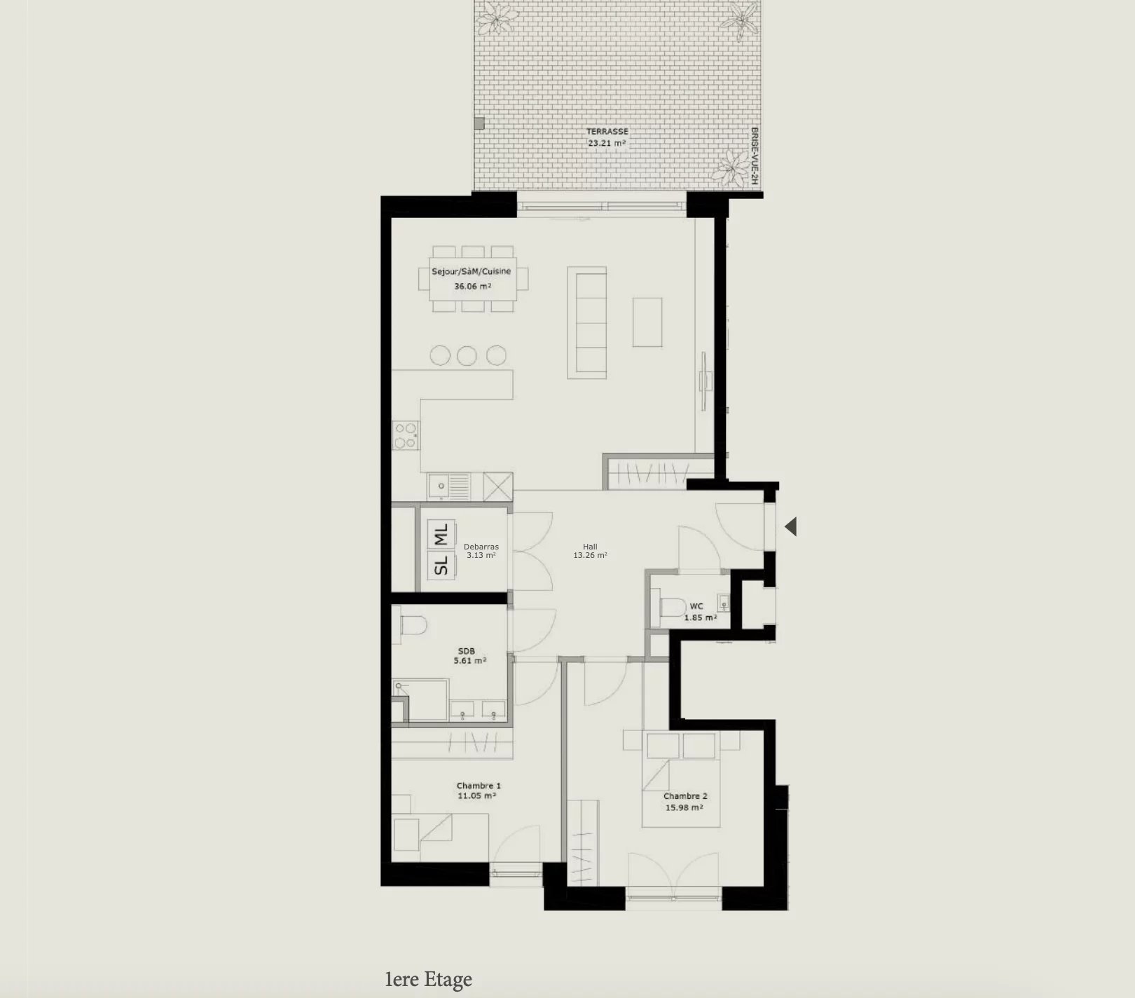 Situé au 1er étage avec terrasse, appartement 2 chambres d'une surface habitable de 86 m2 composé comme suit :