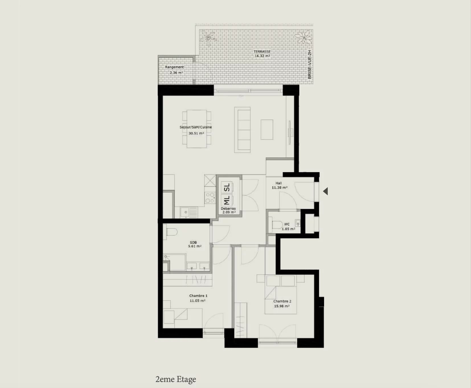 Situé au 2ème étage avec terrasse, appartement 2 chambres d'une surface habitable de 78 m2 composé comme suit :