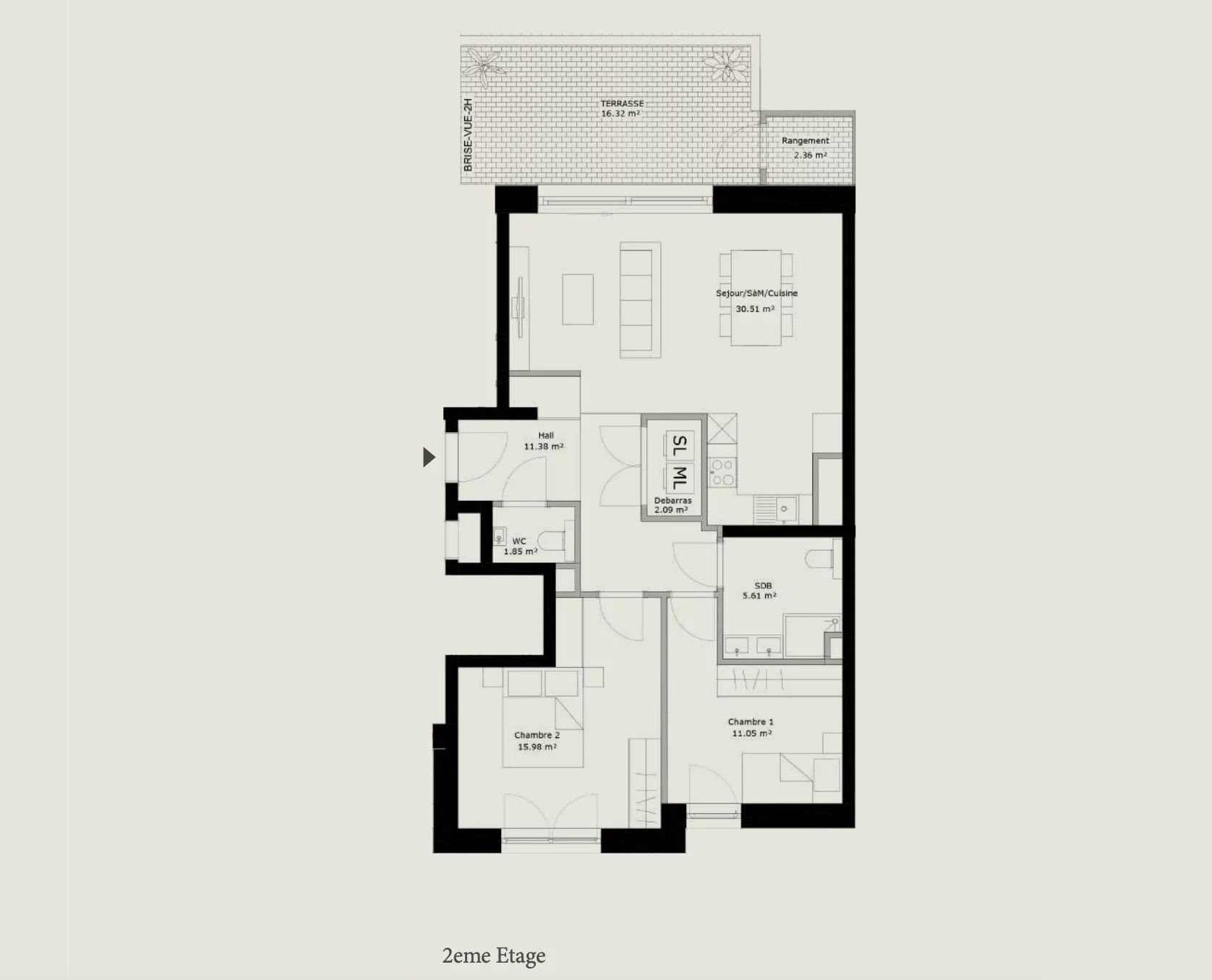 - Terrasse de 16 m2 avec espace rangement fermé